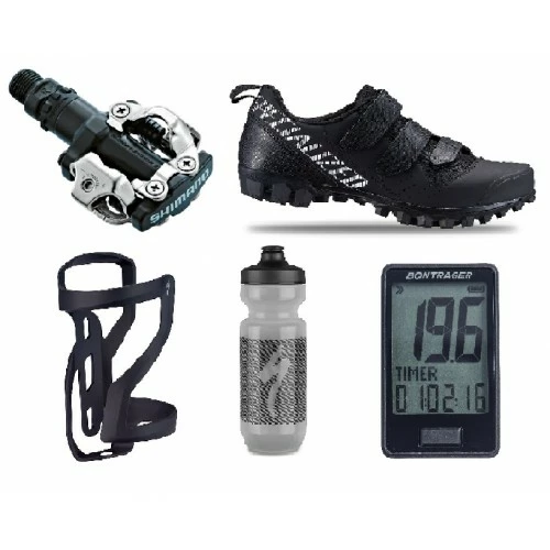 Udstyrspakke til MTB SKOV indeholdende -Shimano SPD pedaler (M520)-Specialized MTB sko (Recon 1) (notér størrelse i kommentar)-Drikkedunksholder i plastik der matcher cyklen, (MTB sideudtræk)-Kvalitets drikkedunk der matcher cyklen-Cykelcomputer trådløs, med basisfunktioner (hastighed, distance, gennemsnit hastighed og ur)Udstyrspakken er et tilbud der kun kan vælges samtidigt med en Mountainbike. Til gengæld monteres udstyrspakken på cyklen inden den afsendes fra os.Afprøv venligst skostørrelse inden klamper monteres under skoene. Følg vejledningen der medfølger skoene for en korrekt placering af klamper.Der bruges udelukkende kvalitets udstyr fra kendte brands, Farve og model kan afvige fra det afbilllede, men hvis afvigelsen er markant, kontaktes du inden afsendelse